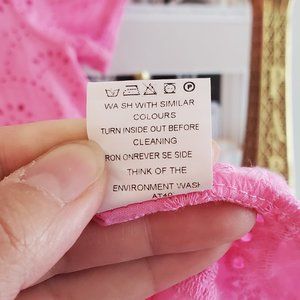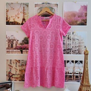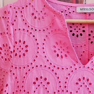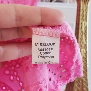 Sweet bubblegum pink eyelet lace dress by Misslook. Features V-neckline and ruching on bottom hem. Scalloped trim on front. Unlined. Use as a swimsuit cover-up or pair with a slip as a dress. Perfect for hot summer days. Pullover style. Fabric has no stretch.
