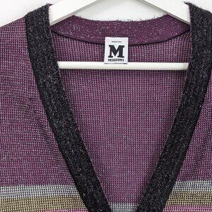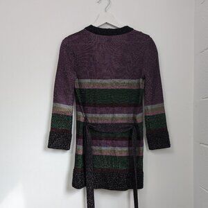 viscose purple striped cardigan with belt included, fabric covered sparkly black buttons, made in Italy