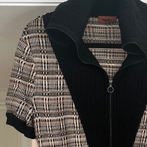 Gorgeous, never worn black, brown, tan and ivory Missoni knit short-sleeve Dress with wide neck zip-up collar. Absolutely perfect for the transition to Fall! Amazing classic Missoni style in a wool/rayon knit blend. Size US 12 (IT 48) but close cut so forgiving on a size 8-10 body. Last three photos show dress on model in a different colour way for fit purposes. Any rumples are simply due to storage - item will be fully steamed and pressed before shipping!