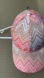 Vibrant Missoni cap with a multicolor zigzag design. Features pink, orange, and white hues.