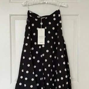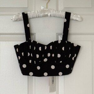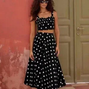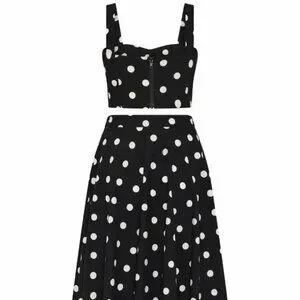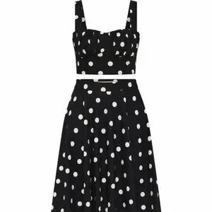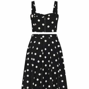 Two-piece cotton set featuring a structured bustier top and flowing circle skirt. Wear together or mix and match. The perfect black & white polka dot combo!