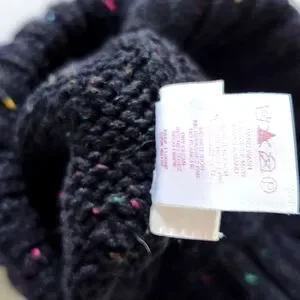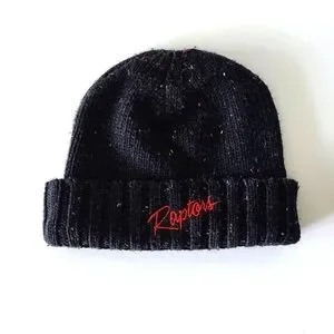 Black knit Raptors touque from Mitchell & Ness. Features red embroidered Raptors logo, ribbed knit detail, and rainbow speckles.