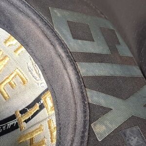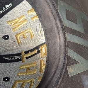 Dirt on the underside of the brim and inside the hat. One of the plastic nubs is missing on the snap Back. Adjustable size.