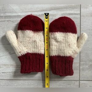 Previously Owned. Cozy mittens made from wool with a soft interior lining. No material/size tag- please refer to photos #4-5 with measuring tape for sizing visual. Unable to confirm material - interior lining has a fleece like feel. These mitts have some light, visible wear on front & backs as pictured in photos. They have a nice, cozy feel with a classic design on them!