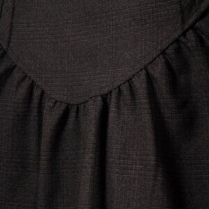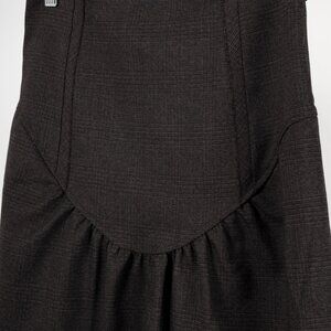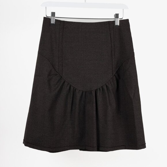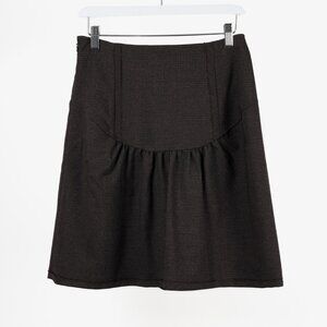 A vintage-style brown wool mini skirt from Miu Miu featuring a curved drop waist silhouette, light pleating at the front and back, a side zip closure, and interior lining.