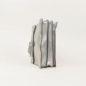 The Madras Bandoliera shoulder bag from Miu Miu is made with a pebbled goatskin leather in a metallic cromo, and features silver-tone hardware, an adjustable and detachable crossbody strap, a leather handle, a travel tag, a back zip pocket, accordion sides and bottom, and a flap with a push lock and magnetic closure. The interior is lined in a soft leather with three compartments and a flat zip pocket.