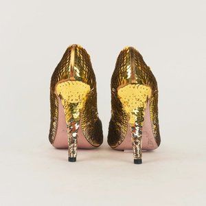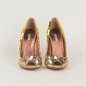 Circa 2008, these sandals from Miu Miu are sequined all over in a gold ombre design, and feature stiletto heels, peep toes, and are lined in a metallic bronze leather.
