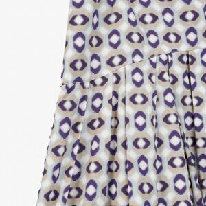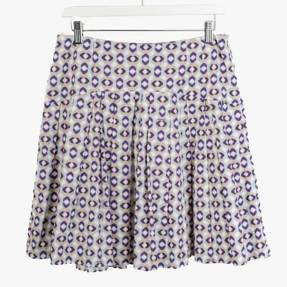 This unique skirt from Miu Miu's 2008 Resort collection features a purple and white abstract geometric pattern printed throughout the body, pleated accenting, and concealed side zip closure.