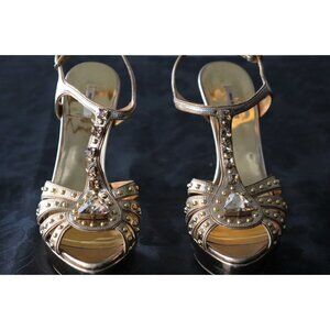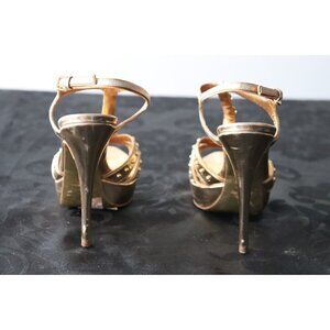 Miu Miu Womens Size 37 Gold Studded Sandals Open Toe Crystal Strap Stiletto Heel