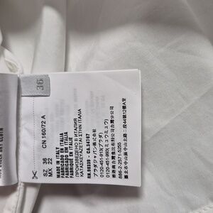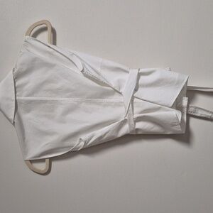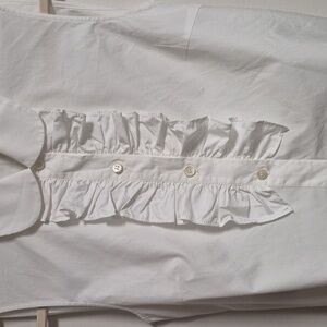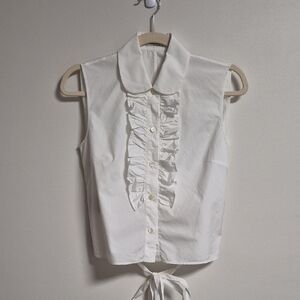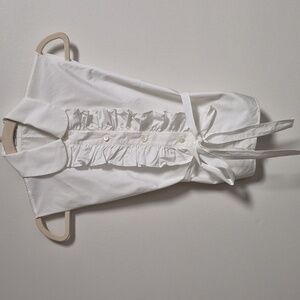 White cotton sleeveless top with a ruffle down the front. It has an attached belt that wraps around the body. 100% cotton. Luxury brand. Pit to pit is approximately 18" and length is 19". Gently worn.