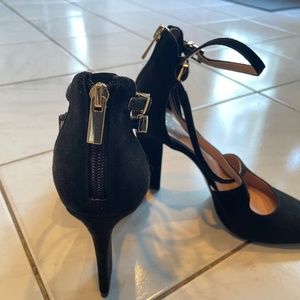 Black suede, comfort heel. Cross strap, these are very sexy on. Zipper at back heel.