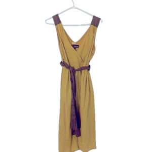 Perfect for any occasion! Fun and airy in soft cotton it features a gorgeous Brown and Mustard color combination with a stylish draped design. Tie at waist. Side zip. Fully lined. A sleeveless dress in a midi length that adds a touch of elegance.