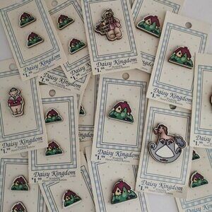 Mixed Lot of Daisy Kingdom Vintage Wooden Buttons 35 Total, NOS Cute Houses Bear