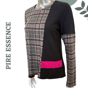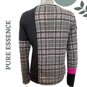 Elevate your everyday look with this uniquely stylish Pure Essence tunic. Featuring a soft plaid panel contrasted with black jersey and a pop of bold pink, this top brings playful sophistication to your wardrobe. Designed with comfort and creativity in mind, it’s perfect for work or weekend wear.