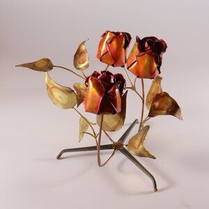 Mixed Metal Roses & Leaves Sculpture Iron Stand Tainted Copper Gold & Dark Red
