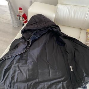 Removable hood, zippered pockets.