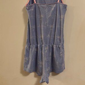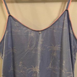 Cute and comfy pajamas in a soft, breathable, easy stretch material. Colour is light blue that borders on lavender with peachy-pink details and a whimsical tropical pattern. The straps are adjustable, and the waist is elastic. I would consider the bottoms as short shorts – this piece would fit a size 4-6.