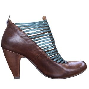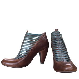 From edgy New York Designer Miz Mooz comes the caged Sloane Pump with two-tone leather in chestnut brown and turquoise blue. Features a unique strappy design, back zipper, and 3.25” heel.