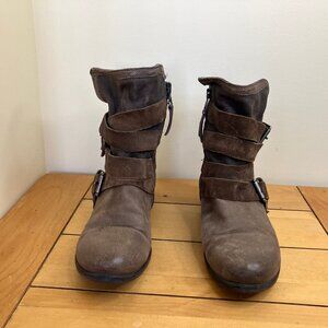 Miz Mooz Savvy Leather Ankle Boots Moto Harness Buckle Strap Brown/Grey