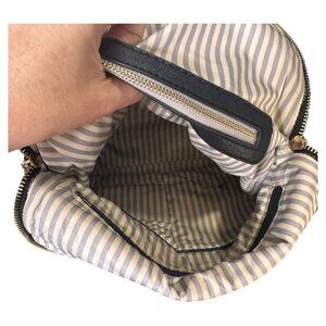 * ORGANIZED ELEGANCE: The zippered flap top opens up to a chic black and white striped lining and internal pockets for organization: The hidden back zippered pocket is a perfect place for your smartphone or wallet for secure and quick access