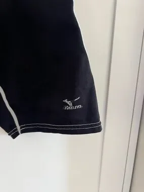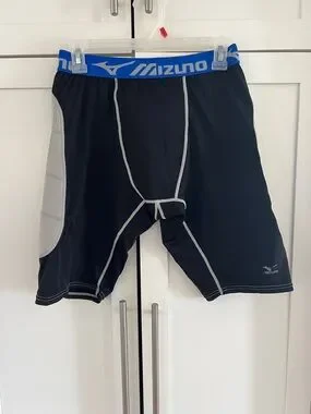 Supportive athletic compression shorts built for performance. Black body with contrast blue waistband and light gray stitched accents. Padded side panel adds protection during contact sports. Elastic waistband features Mizuno branding for secure fit.