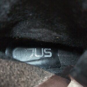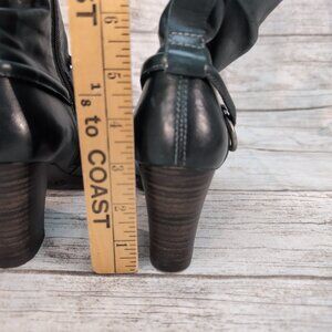 Great condition with some intentional distressing on the leather. These boots have a fuzzy lining and a stacked comfortable heel . They have leather and metal details across the top of the foot in a harness style.