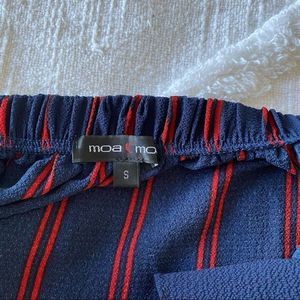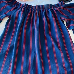 navy and red off the shoulder top with ruffle sleeve detail size small. Would also fit a medium and it’s a loose fit