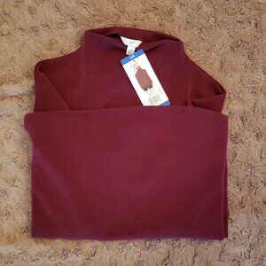 This burgundy mock neck long sleeve has drop shoulders, is a soft polyester blend. Machine Wash dry . The back is about 1/2 inch longer than the front for that added tosh coverage and great style.