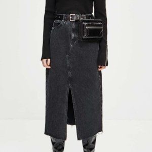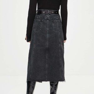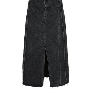 Excellent condition. Black maxi denim skirt with large slit. Tags removed. Frayed hem.