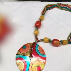 Mod GEOMETRIC DESIGN SHELL Necklace, Chunky, Colorful Lucite Beaded Multi Strand