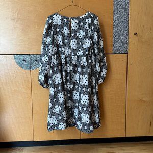 Easy to wear black and white floral/polkadot dress with bell sleeves. Can carry through work in fall or sping with a pair of tights and trainers or boots or bare legs and sandals. Vintage vibe in a new piece in excellent condition.