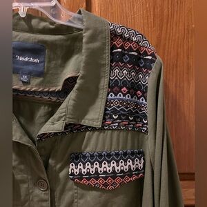 ModCloth Assorted Occasions Anorak Utility Jacket in army green with embroidered tapestry accents. Size 3X. Good condition with one spot on the back of the jacket (please see pic).