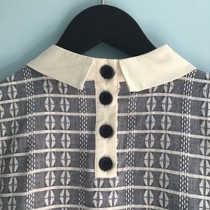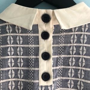“This A-line dress from the ModCloth namesake label delivers on your fashion daydreams! Its chambray is woven with a white pattern that totally stands out, but that’s not all. This frock flaunts a cream collar, a buttoned back, a gathered waist, and hidden pockets.”