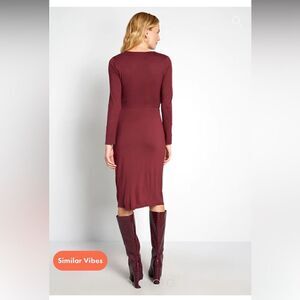 This burgundy, ModCloth label midi dress gives new life to a classic wrap silhouette with its long sleeves, surplice neckline, and ruched detailing—a subtle but chic detail that makes a surefire statement.