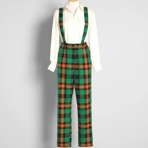 You’ll always be glad you chose plaid when you’re wearing these green plaid pants from our latest collab with UK label Collectif! Made from a smooth, stretchy woven fabric, these high-rise trousers boast a bold, all over checkered plaid pattern in contrasting red and navy blue hues that make this pair a sure-to-be staple in your fall and winter wardrobes. With an elasticized panel at the back waist, and removable suspender straps that are also adjustable, these vintage-inspired ModCloth x Collectif pants offer a tapered, tailored look with an ultra-comfy fit.