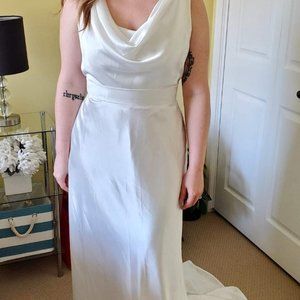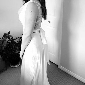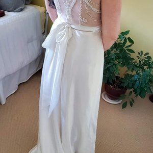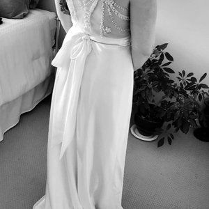 Ended up changing venues and wanted a different dress. It's gorgeous with perfect beading and buttoned upper back. Would be fabulous on a bride with narrow shoulders.