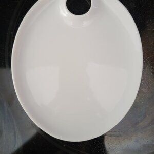 These plates are perfect for entertaining! Your cocktail party guests will enjoy having a plate with a slight raised rim to contain their appetizer or charcuterie board choices as well as hold their wine or cocktail glass / goblet. Each plate is a bright white with an approximately 1/4 inch high raised rim and featuring a round cut-out area perfect for stowing a wine glass or goblet. In very good condition with the only wear showing on the bottoms. Dishwasher and Microwave safe. Measures 8 inches by 7 inches. Heavy Plates