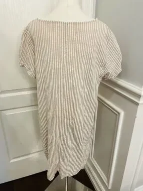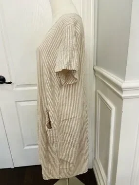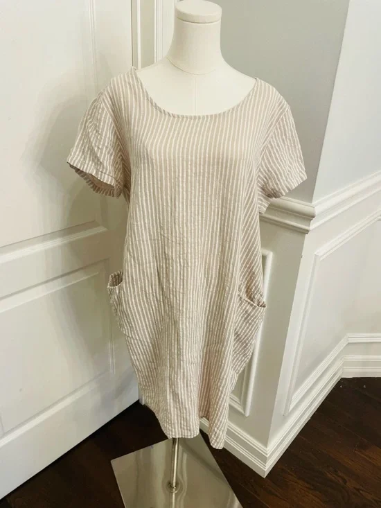 Soft textured linen fabric blend with a subtle weave. Scoop neckline and short sleeves. Two front pockets for convenience. Easy, relaxed fit for everyday wear. PP 23 inches Length 36