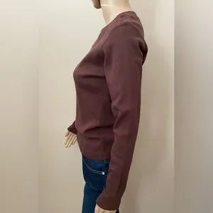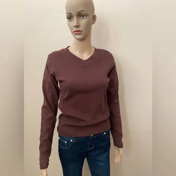 Brown Long Sleeve Vneck Sweater. Ribbing at neckline.