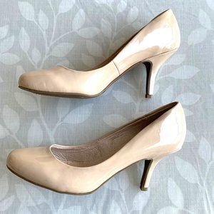 A classic style pump perfect for the popular chic neutral look. Designed in patent leather with a rounded toe, leather lining, Moda Reflex insole for added comfort, and non-slip rubber sole. Heel height 3 inches (7.5cm). Perfect condition. Worn once.