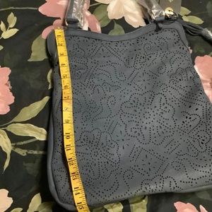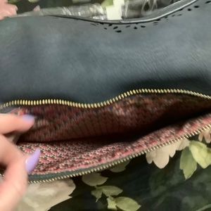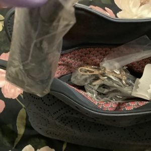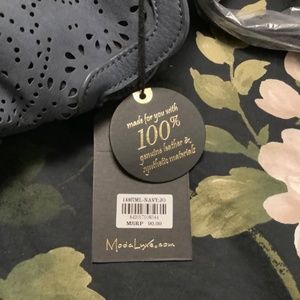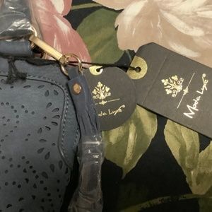 NWT Moda Luxe handbag. Has several deep pockets, a removable tassel on the side, and optional strap. Genuine leather. It’s a dark navy with a lovely lining, cute perforated design, and gold zippers. Tons of storage space. Paid $90 USD.
