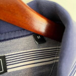 casual polo Men's Blue Striped Polo Shirt. Featuring a classic design with a comfortable fit, this shirt is perfect for any occasion. The blue and white stripes add a touch of style to your look. Size medium EUC