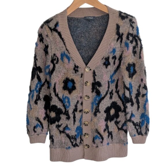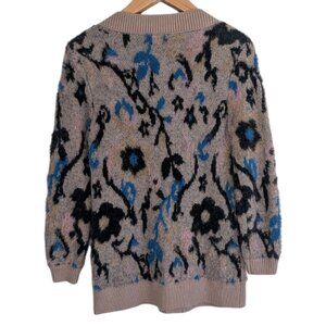 This is a fuzzy long cardigan sweater by ModCloth. Beige with an allover black, blue and pink floral print.