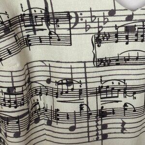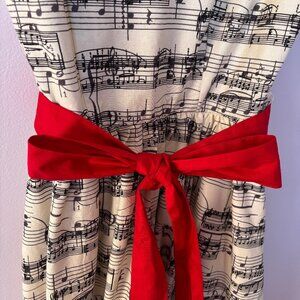 This whimsical dress is the perfect fit or a musician or music enthusiasts attending her next concert. It is a sleeveless, fit and flare style that hits just above the knee. The waist is accentuated with a detachable red cotton sash belt. The dress is fully lined, with no see-through. The back closure is a zipper with one hook at the top. There are 2 hidden side pockets. The musical score fabric is 100% cotton and the lining is a plain cream, also in 100% cotton. This dress has never been worn.
