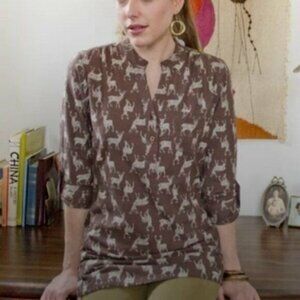 The Near and Deer Top by Mata Traders from Modcloth in Brown and Women's Size XS. 100% cotton. Button down popover. Collared. Long roll tab sleeves. Chest pocket. Very good pre-loved condition. No visible flaws.