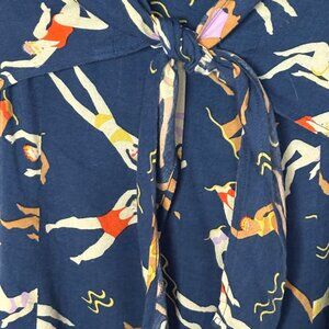 This quirky dress with a print of synchronized swimmers is an eye-catching pick for your next pool party or beach excursion. The v-neck has a tie front that allows you to adjust to your body, and then there is a flared fit from under the bust down, hitting at the knee. The back has a zipper closure with one top hook. The fabric is 100% rayon with minor stretch, and is fully lined with a plain navy blue rayon so it's not see through at all. It has pockets!