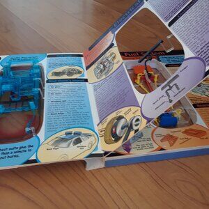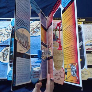 3D skeletal book with engine model, plastic overlays-teaches all about how cars function, hands on, layer by layer, deconstruct and rebuild the engine just by turning the pages