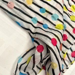 Brighten your outfit with this modern artistic scarf featuring a joyful pattern of multicolored dots and black stripes.