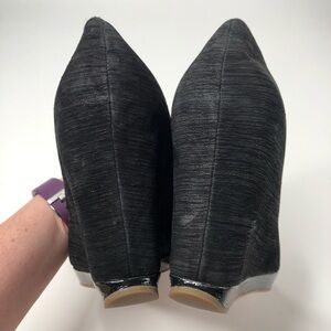 Modern Vintage leather black peep-toe wedge platform shoes. Comfy and great for the office! Accented with a shiny strip at the base of the wedge & are a textured bark-like micro suede fabric. I put heel cushions in the back to make them fit me a bit more snug (it’s comfy too) but they can be easily peeled off. Worn once! In excellent used condition; only flaws are normal wear to the soles & peeled stickers on the cushioned insoles. Please see photos for measurements and details. Women’s size 10 (40).