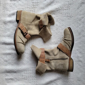 Modern Vintage Slouched Over the Ankle Zip up Belted Stacked Heel Boots - Small wooden stacked heels, buckled "belts" welt-seaming across the toes and inside zippers make them stand out from all the others. Very, very lightly worn and ready for Fall!